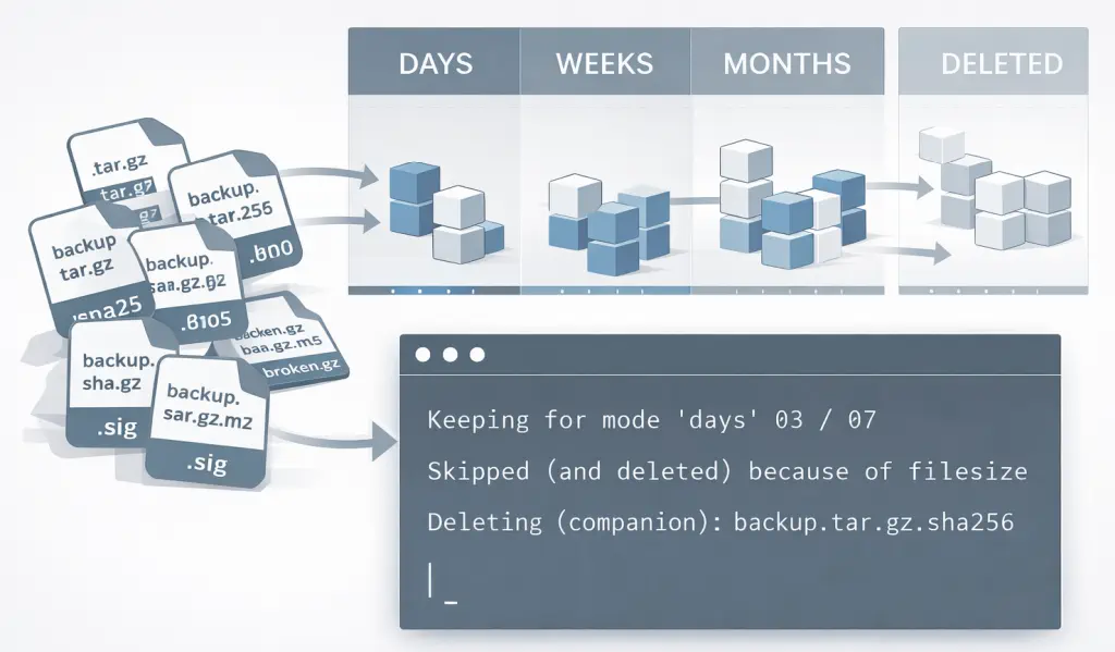 retentions /data/backups '*.sql.gz' -l 5 --delete-companions 'suffix:.sql.gz:.sig' -V infoNewest backups are pinned by --last 5. Older ones are removed – including their .sig files.